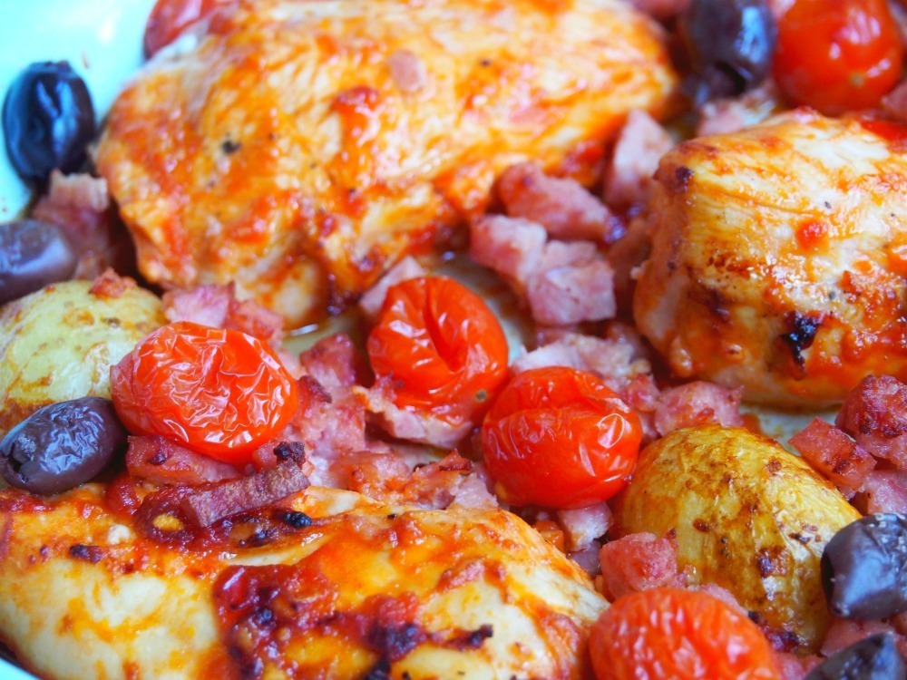 - Den Bauchspeck unterrühren und weitere 15 Min. braten, dann die Tomaten hinzufügen und weitere 15 Min. braten, bis die Tomaten weich geworden sind und das Huhn gar ist. Direkt aus der Pfanne servieren und mit einem grünen Salat und ggf. etwas Brot zum Auffangen des Bratensaftes essen.