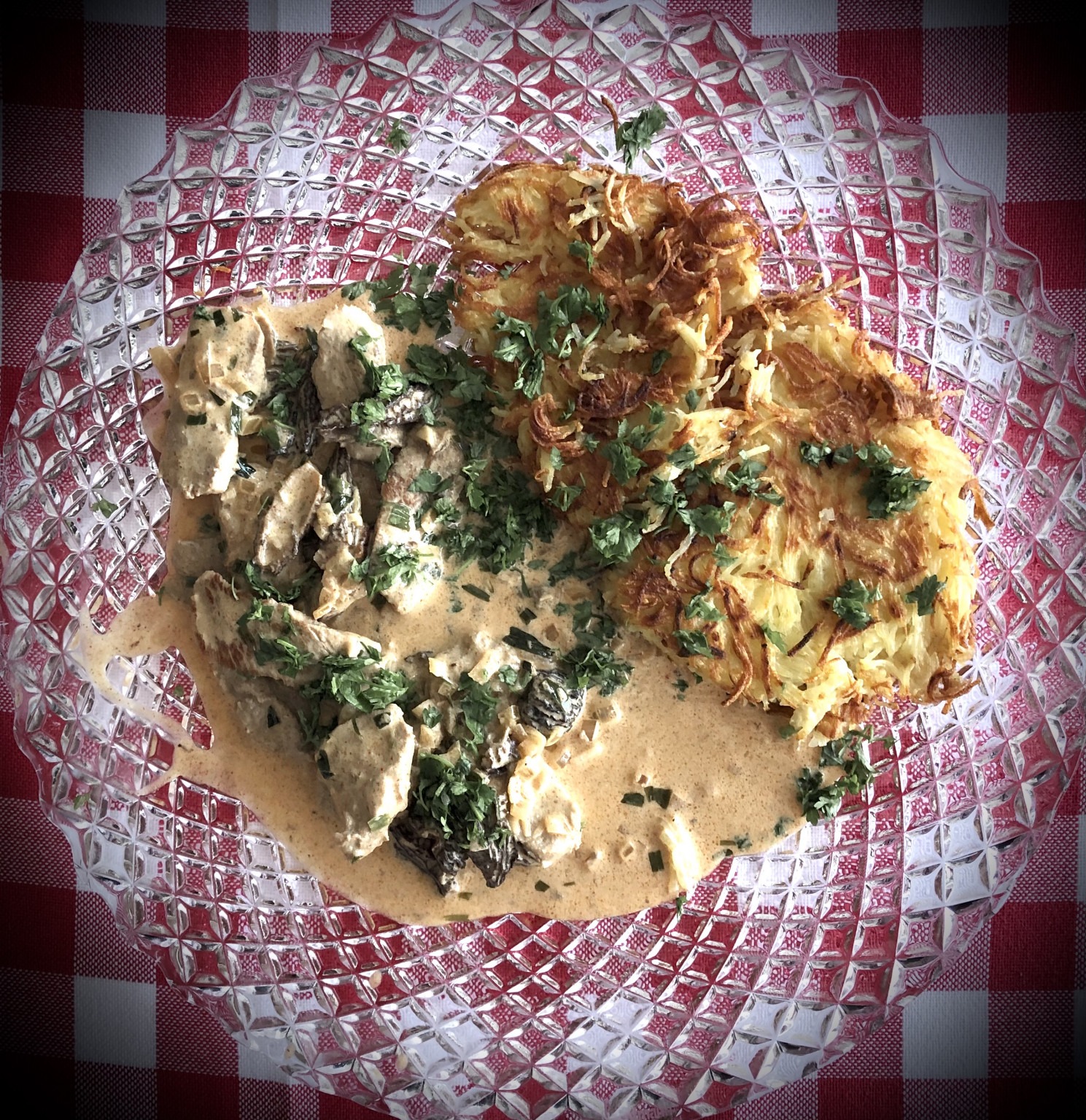 - Die Kalbsschnitzel auf Tellern anrichten und mit der heißen Morchelrahmsoße übergießen. Mit frischer Petersilie garnieren. Dazu passen Bandnudeln, Kartoffeln oder Spargel.